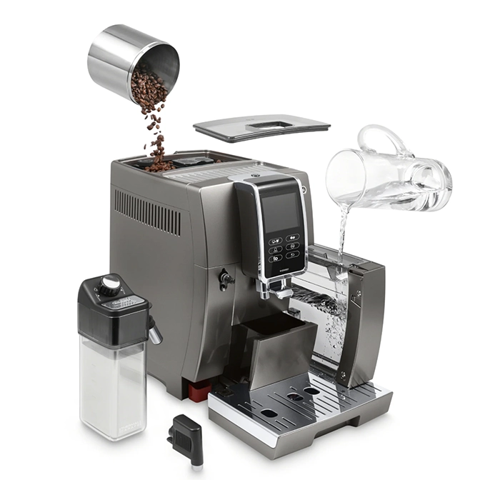 A sleek DeLonghi Dinamica LatteCrema in silver, showcasing its modern design and LCD display