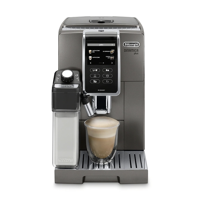 The DeLonghi Dinamica Plus Connected ECAM37095TI is a striking and modern app-compatible super-automatic espresso machine that elevates your home coffee experience. It features a full color touch screen display, an adjustable auto-frothing carafe, and offers 16 customizable espresso and specialty coffee recipes, including innovative TrueBrew Over Ice for authentic iced coffee. With its integrated conical burr grinder and seamless connectivity, the Dinamica Plus Connected provides robust customization and ultimate convenience