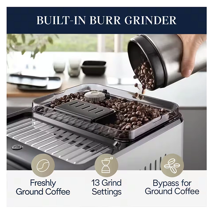 • Bypass Doser: Provides the option to use pre-ground coffee, useful for decaf or specialty roasts.