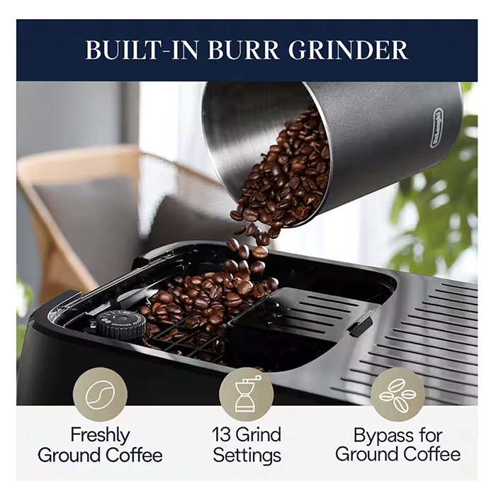 - Built-in Conical Burr Grinder: Delivers fresh, precise, and consistent doses of coffee. It features adjustable grind settings to optimize flavor extraction.