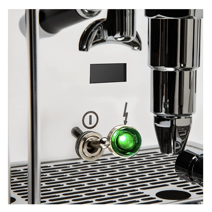 Located discreetly to the bottom left of the E61 group, the newly added LED display sits above the power switch. By default, the display remains blank when the machine is turned on, conserving energy and maintaining its minimalist aesthetic. It will only illuminate to confirm menu and temperature changes, alert you when the machine is heating up or the water tank is low, and most importantly, to display a clear shot timer when the brew lever is engaged, guiding your extraction. Additional features include an optional pre-infusion mode to briefly wet coffee before extraction and an eco mode to power down the boiler after a set period of inactivity, further enhancing energy efficiency.