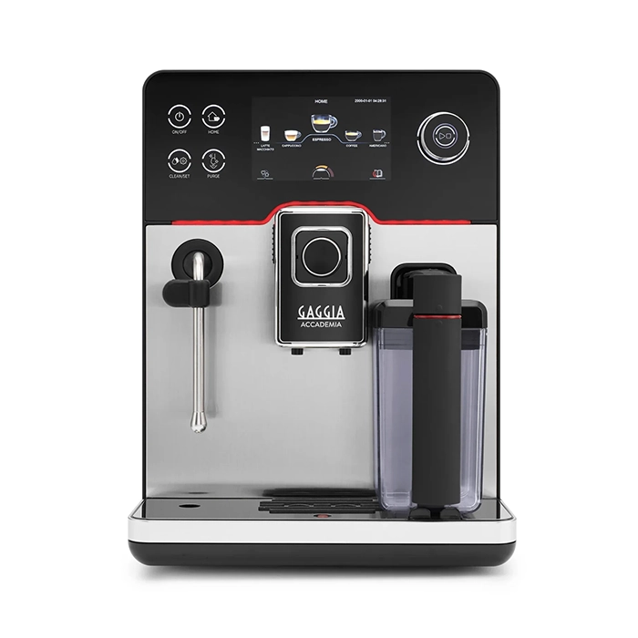 The Gaggia Accademia Brushed Stainless is a luxury Italian espresso machine, meticulously designed and in the outskirts of Tuscany. It is a fully automatic bean-to-cup espresso machine that boasts an expansive and customizable menu of 19 distinct beverages. Milk drinks can be prepared precisely to your liking, either with the convenient automatic frothing carafe or by utilizing the versatile commercial steam wand to produce latte art-quality milk foam. The Accademia is further distinguished by its incorporation of premium materials into its design, featuring robust all-steel housing and a striking black glass front panel. Its 5-inch touch display offers phone-like responsiveness, providing intuitive menu navigation and seamless beverage preparation.