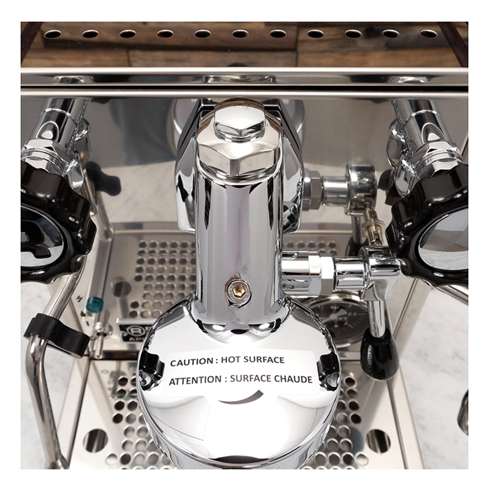 Internally, the Appartamento employs a large 1.8 L copper boiler, which, in concert with a 1200 watt heating element, makes for impressive strength brew after brew. Integrated electronic sensors diligently monitor both the boiler and reservoir levels for low volumes, issuing alerts to prevent any issues. If, for whatever reason, these warnings are ignored, the Appartamento is designed to safely shut down automatically to avoid a dry-boil. This protective feature ensures the machine continues functioning at its best for years to come.